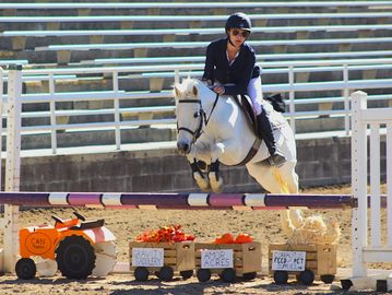 Jumped over a course of obstacles set at 0.60 or 0.80m. Ride with a paper pumpkin under your leg. Fastest time with pumpkin still under leg wins!